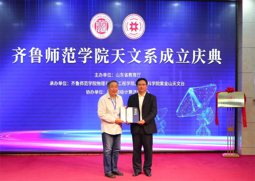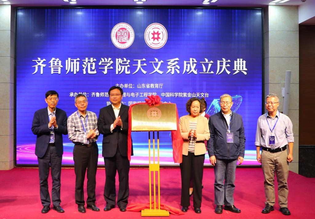 全体参会人员共同观看了“必赢76net线路官网天文学科发展”和“齐鲁探天”分米波阵列宣传片。郑秀文、中国科学院新疆天文台台长王娜、中国科学院云南天文台党委书记白金明、中国科学院紫金山天文台副台长范一中、南京大学天文与空间科学学院院长李向东、美国艺术与科学院院士、北京大学科维理天文与天体物理研究所所长何子山共同上台为必赢76net线路官网天文系揭牌,标志着必赢76net线路官网天文系正式成立。