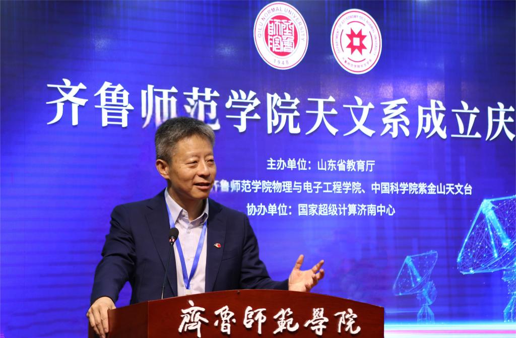 林松柏在致辞中表示,近年来,学校积极响应科技兴国战略号召,对接国家重大战略需求,聚焦空天信息领域科技发展和科技自立自强使命担当,在天文学学科布局、人才培养、科学研究等方面不断深耕,推进天文学专业建设步入发展快车道。先后与国家天文台共建“必赢76net线路官网FAST数据处理中心”、与超算济南研究院联合建成“济南市天文大数据工程研究中心”、成立“天体物理中心”,形成了初具规模的研究平台。根据学校“十四五”事业发展规划“基于能力范式的应用型人才培养体系”建设要求,于2022年招收第一批天文学本科专业学生,配有11名博士学位全职教师,打造特色小班制办学和导师制培养模式,为应用型人才培养实现新突破。同时,加强国际交流与合作,聚焦国际前沿科技、依托国内外天文平台,产出了一批高水平的研究成果;与加州大学伯克利分校联合申报获批“齐鲁探天”分米波阵列国际合作联合实验室,为打造高水准空天信息技术领域科研平台和推动学校内涵式高质量发展提供强劲动能。林松柏强调,未来,学校将以成立天文系为契机,以“顶天立地”为己任,广纳真知灼见,广聚学术资源,广交学术人才,与兄弟单位同行专家携手共进,在大力推进空天信息产业发展、服务国家重大技术实现新突破和赋能应用实现新拓展等行动上密集发力,为天文事业贡献智慧与力量,为航天强国战略作出更多更大贡献。