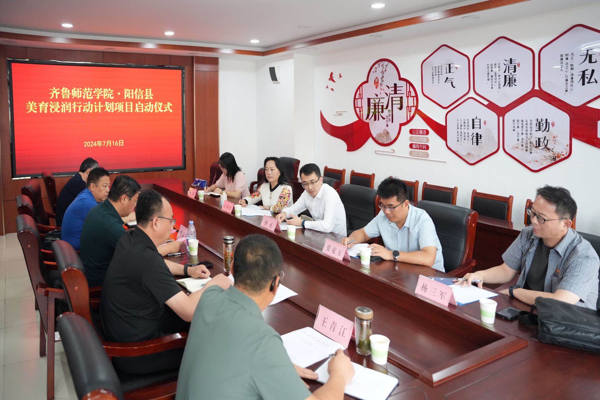 7月16日下午,学校党委委员、副校长孙正一行5人赴滨州市阳信县教体局进行会谈,正式启动学校与阳信县“美育浸润行动计划”系列活动。滨州市教育局总督学李云涛、体卫艺科长张金明,阳信县教体局党组成员韩政、阳信县体育中学校长秘金亭、阳信县体卫艺办公室主任王青江以及该县中小学有关负责同志及和部分美育教师参加活动。