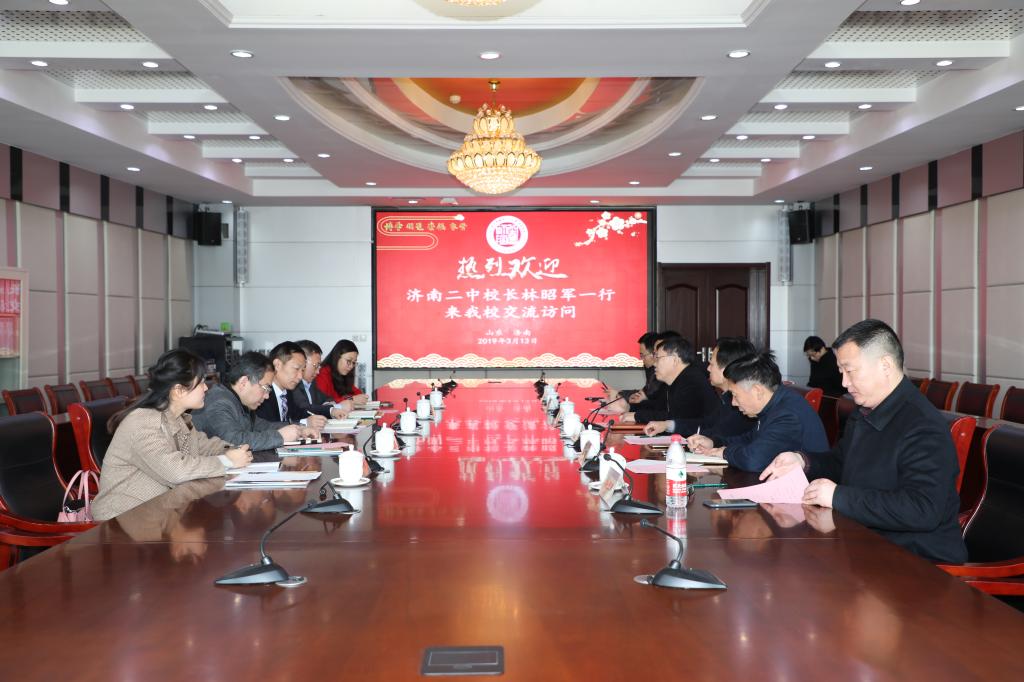 3月13日,济南第二中学校长林昭军,副校长李伟一行来必赢官网交流访问。学校党委副书记、校长林松柏会见了访问团一行,校长办公室、团委、教务处、国有资产管理处、山东省中小学师训干训中心负责人参加了会见。