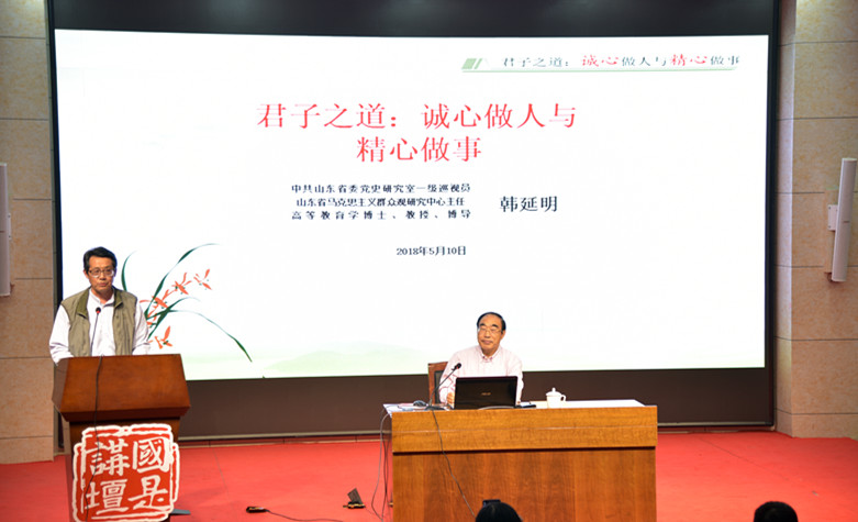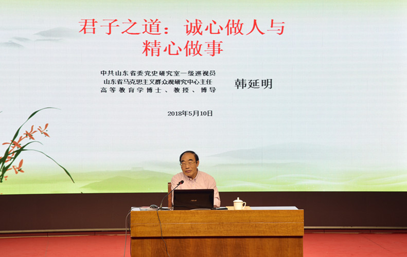 5月10日,著名高等教育研究专家、中共山东省委党史研究室一级巡视员韩延明教授莅临“孔子学堂”、坐客“国是讲坛”,为必赢官网师生解读“何为君子之道”。党委宣传部、团委和马克思主义学院负责人到会,“孔子学堂”全体学员及参加“青年马克思主义者培养工程”的全体学员近400名同学到场聆听。