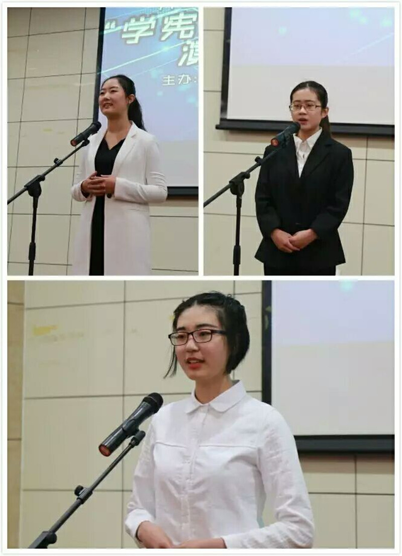 比赛中,选手们用通俗易懂的语言、生动活泼的事例,深入浅出地讲解了宪法的内容,让在场的观众对宪法赋予公民的基本权利有了更深的认识。演讲主题,或围绕国家、公民、权利、义务等宪法理念,别出心裁的用法律案例证实宪法的重要性;或结合社会主义核心价值观中的“爱国、敬业、诚信、友善”道德规范,高瞻远瞩的用所感所悟阐释了宪法对我们当代大学生的影响。他们自信沉着,激进昂扬,精彩的发言博得了台下阵阵喝彩。