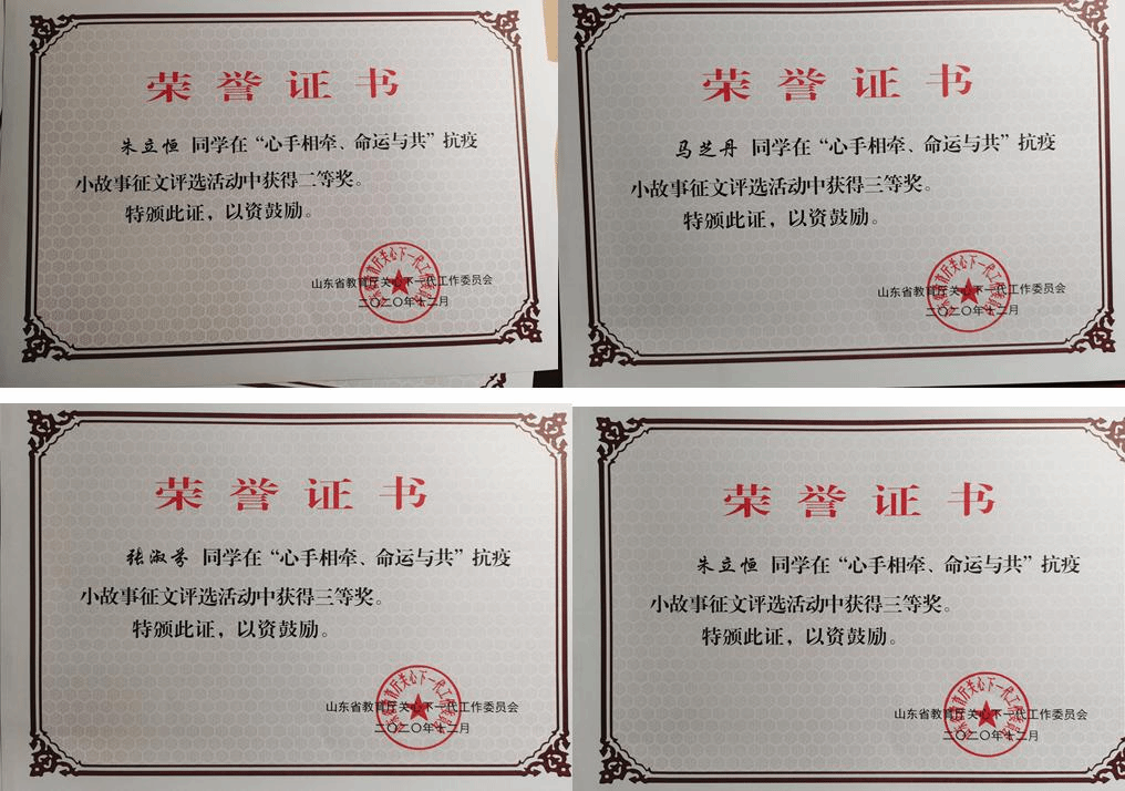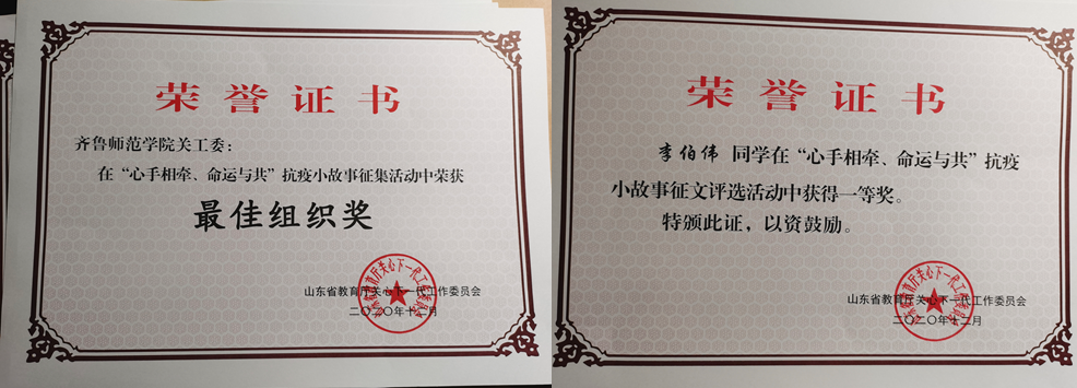 近日,在山东省教育厅关工委组织的全省教育系统“心手相牵、命运与共”抗疫小故事征文活动中,必赢官网关工委荣获最佳组织奖,参评的五篇征文分别取得一个一等奖、一个二等奖和三个三等奖的好成绩。