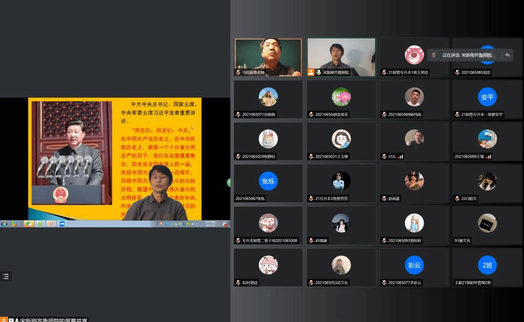 学校领导班子以习近平新时代中国特色社会主义思想为指导,围绕全国两会精神和党史学习教育,以《奋进新征程 建功新时代——学习2022全国两会精神》《文化自信:更基本、更深沉、更持久的力量——学悟习近平总书记关于中华优秀传统文化与齐鲁优秀传统文化的论述》《党的历史使命与行动价值》等主题展开教学工作。通过讲解2022政府工作报告的主要内容、解读两会热词,阐释习近平总书记对传统文化的论述,从党史视域中述说校史,引导学生增强爱校意识并进一步更好地爱党爱国爱社会主义,不断引领师院广大青年学子更加紧密地团结在以习近平同志为核心的党中央周围,增强“四个意识”、坚定“四个自信”、做到“两个维护”,号召同学们踔厉奋发、笃行不殆,为夺取全面建设社会主义现代化国家新胜利、实现中华民族伟大复兴的中国梦做出新的更大贡献。