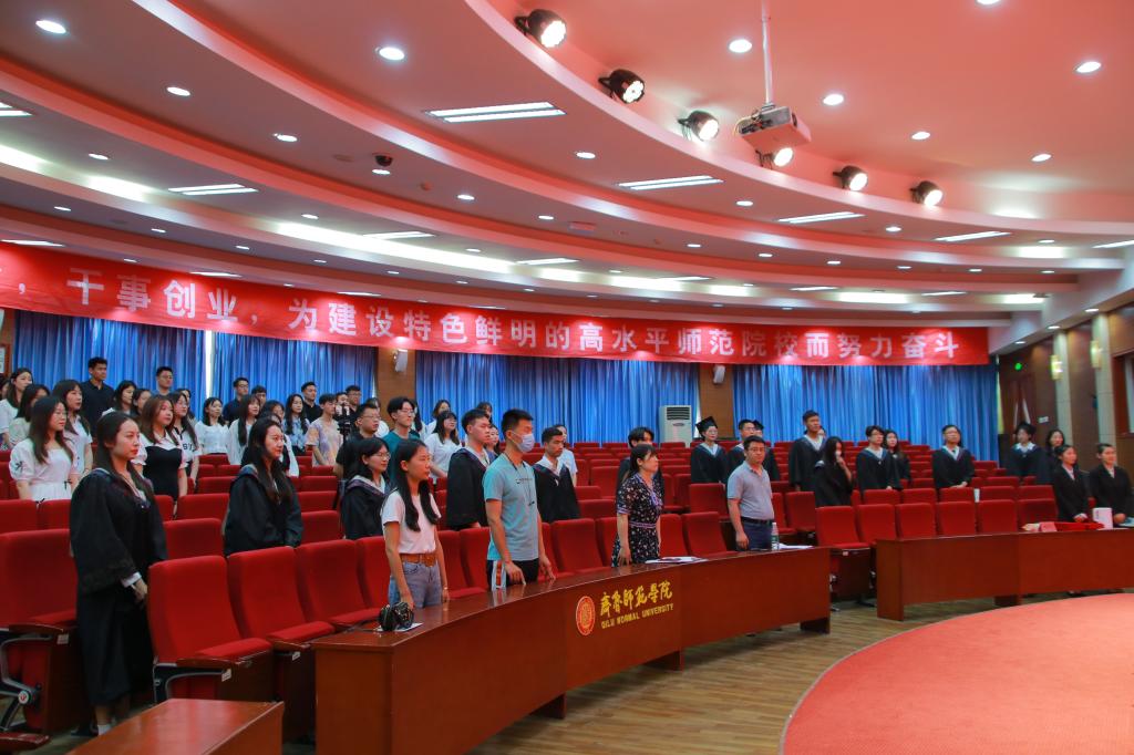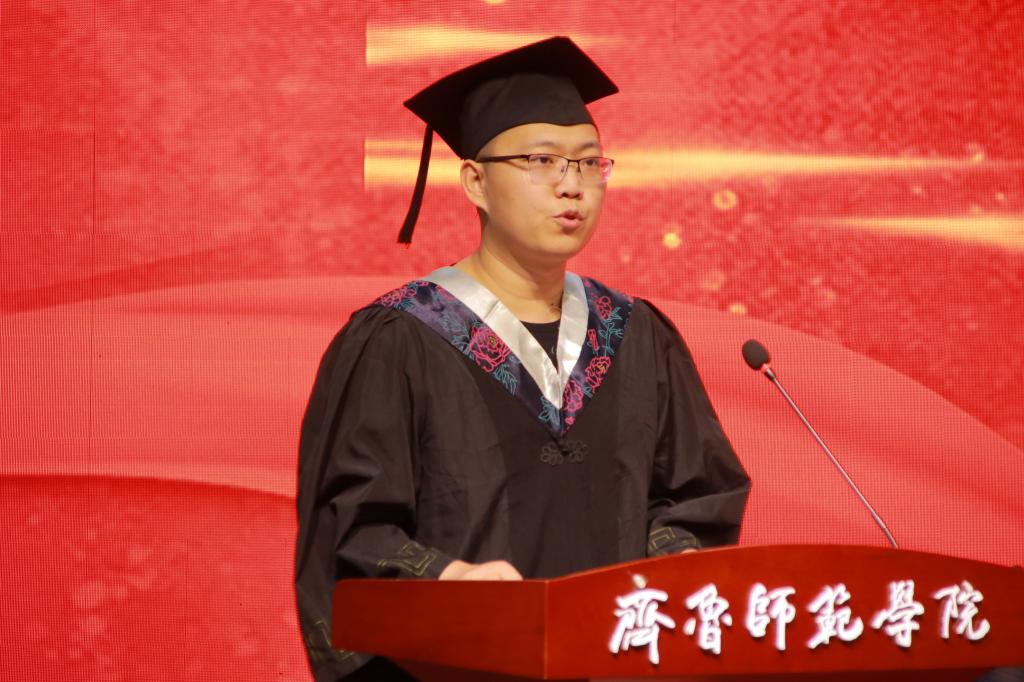 毕业生代表王博在发言中回忆了在学校求学期间的点点滴滴,有收获、有感动、有喜悦、也有泪水,并表示无论毕业后是走上工作岗位还是继续深造,都将以“博学明道,崇德象贤”的校训作为动力,以最饱满的热情去勇敢地面对各种挑战,用最豪迈最稳重地步伐朝着美好的未来努力前进。