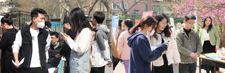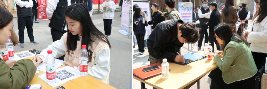 招聘会现场人头攒动,气氛热烈。参会同学在招聘单位前查看信息、咨询情况,积极与用人单位代表交流。不少用人单位的展位前排起了长龙,递交简历、咨询沟通的同学络绎不绝。
