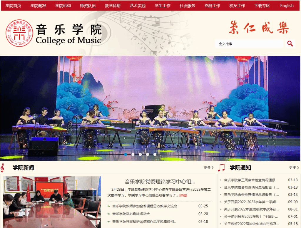 为充分发挥音乐学院的学科特色和专业优势,提升学院门户网站建设管理水平,全面展示学院成果,进一步扩大学院知名度,音乐学院在广泛调研的基础上,对学院网站进行全新改版,并于2023年3月30日正式运行。