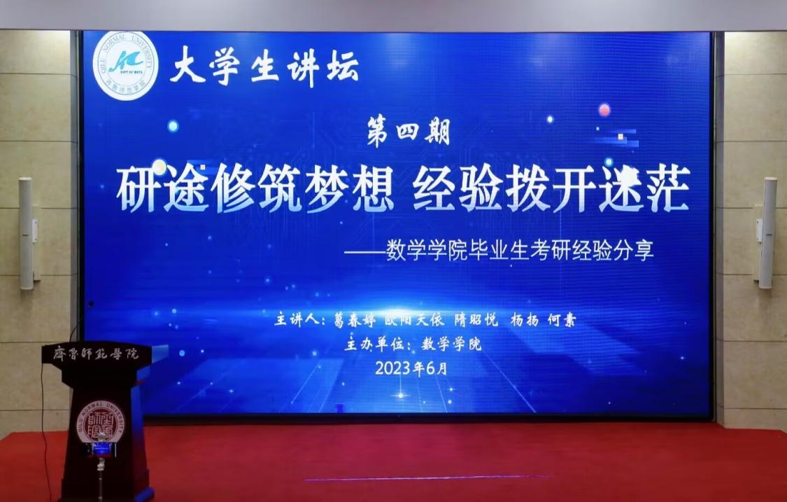 6月8日,数学学院第四期大学生讲坛在章丘校区第一报告厅举行。本期讲坛以“研途修筑梦想,经验拨开迷茫”为主题,邀请了2019级五名考研成功上岸的同学分享考研经验与体会。数学学院2020级、2021级全体学生共300余人现场聆听经验分享。