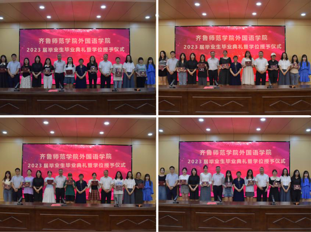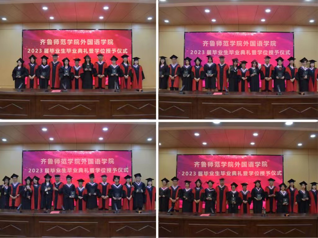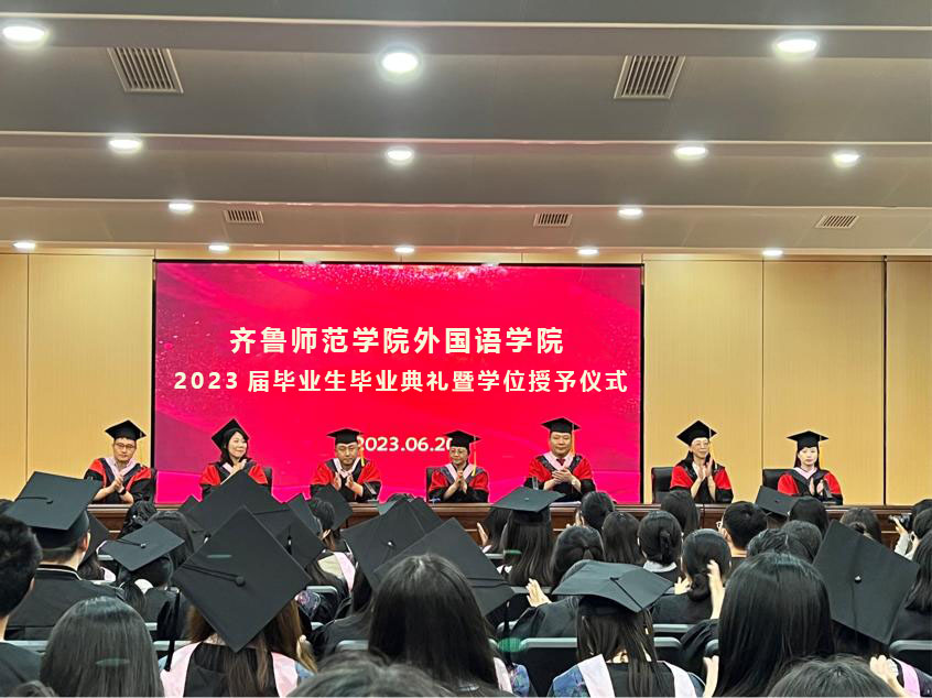 6月15日,外国语学院在章丘校区第二学术报告厅举行2023届毕业生毕业典礼暨学位授予仪式。学院院长宋秀葵、党委书记于江、副院长谢士金、党委副书记迟英娟、团总书记牛荦、翻译教研室主任冯晓凌、商务英语教研室主任石磊出席毕业典礼,学院教师代表及全体毕业生参加典礼。典礼由牛荦主持。