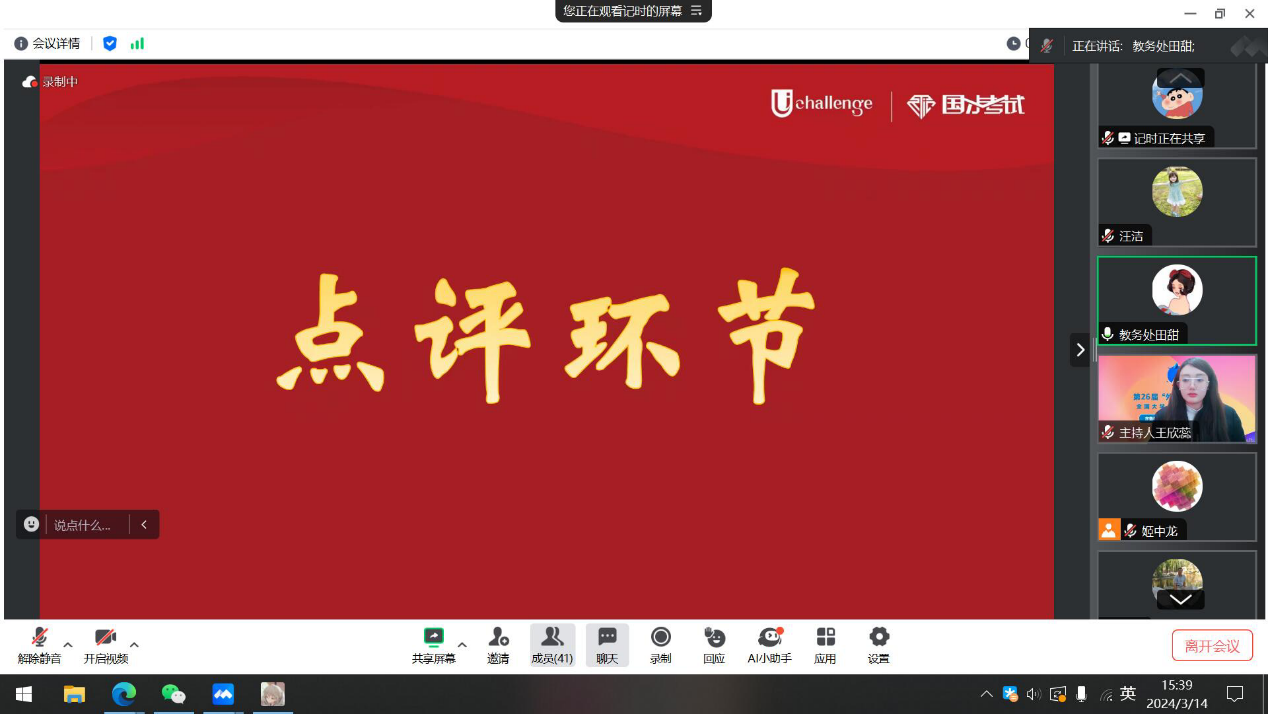 点评环节,田甜、陈锋对辩手们的精彩表现予以高度认可。田甜深入剖析了辩手们在辩论技巧、论据支撑、逻辑结构以及语言表达等方面的出色表现,并提供了宝贵的建议,鼓励同学们积极参与辩论活动,不断提升思辨能力。她特别肯定了外国语学院在学科竞赛中的优异表现,希望同学们能珍惜机会,为未来的学术研究和职业发展打下坚实基础。陈锋则对教务处的支持表示感谢,他强调,外国语学院将继续认真组织好承办的各类学科竞赛,培养和选拔出更多更优秀的外语创新型人才。