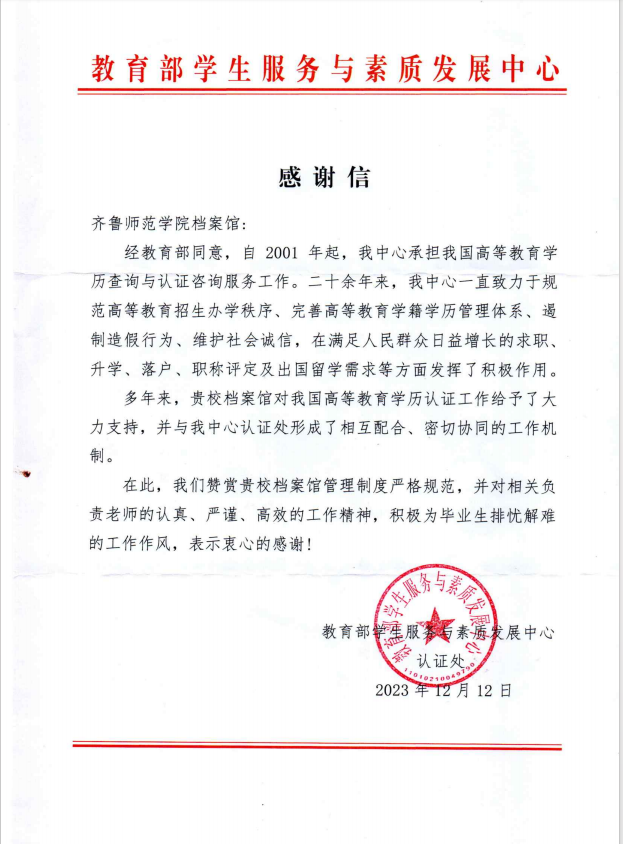 近期,必赢76net线路官网档案馆收到了教育部学生服务与素质发展中心认证处发来的感谢信。感谢学校档案馆用认真、严谨、高效的工作精神,长期协助教育部学生服务与素质发展中心认证处办理毕业生学籍档案查询和认证业务,对学校档案馆的工作表示充分肯定和高度赞扬。
