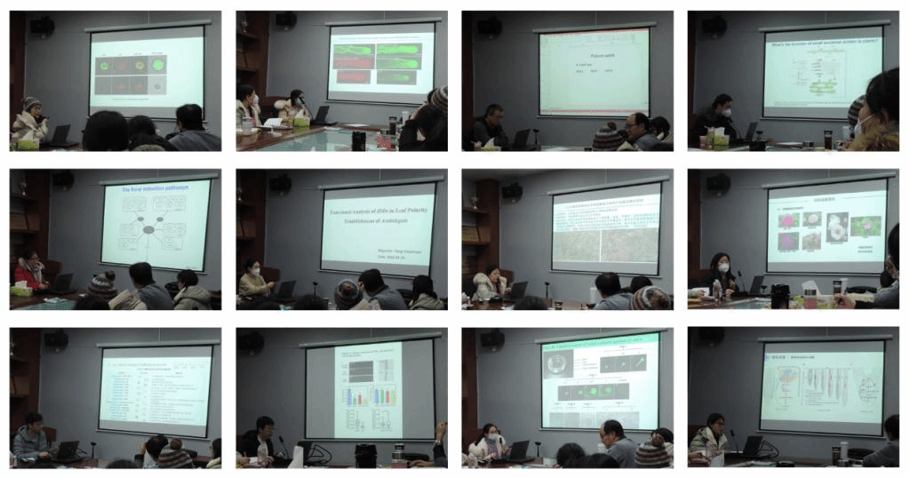 齐心协力,锐意进取。此次年度总结会议上,12名研究骨干和3名硕士生对2022年的研究工作进展和2023年研究规划进行了汇报。高珊博士、刘晓楠博士、马龙高级实验师、赵淑举实验师围绕EXO70s基因家族在植物根系发育、花粉管生长和植物环境应答等方面的作用机制进行详细汇报;谭子龙博士结合国家自然基金项目的研究进展介绍了HTG1基因的相关成果;束德峰博士、马梅博士、杨欢欢博士围绕IDDs基因家族在植物器官大小、开花时间和叶片极性发育等方面的研究工作进行汇报;徐翔博士介绍了大尺度生态研究模型方面取得的成果;李丹博士、陈存博士对园林植物遗传转化体系、关键功能基因研究技术路线及进展进行汇报;2022年新进博士于昕基于基因甲基化的研究背景和现有平台建设情况对研究规划进行汇报与讨论;宫丽雪、冯瑶洁、郭宁3名研究生对2022年的研究进展进行汇报。每位师生汇报结束后,与会人员针对研究的科学问题及研究思路进行积极交流与讨论。