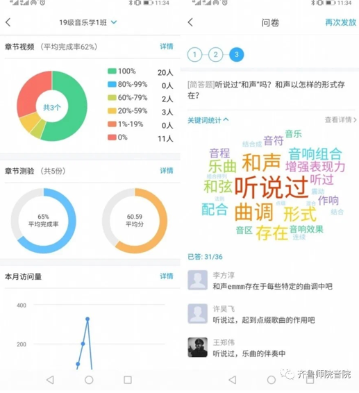 老师们运用群聊、录屏视频资料相结合的方式完成课程,同学们的参与度很高,互动效果好,同时也能运用见面课平台生成课堂报告,有效地记录上课的数据情况。
