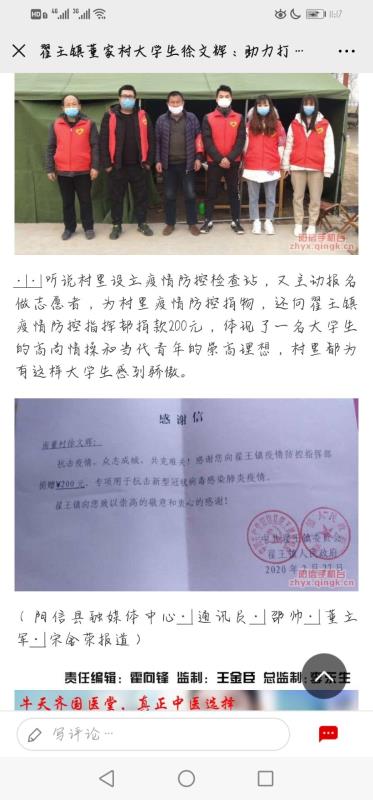 近日,必赢官网物理与电子工程学院徐文辉同学的抗疫事迹先后登上齐鲁晚报·齐鲁壹点及阳信县融媒中心“阳信手机台”等媒体。疫情爆发以来,她一直在家乡默默做志愿者,并捐款抗疫,但在学院统计志愿者、捐款者名单时却从未上报过。对此,她说,“这只是我应该做的。”而像她这样的学生,在物理与电子工程学院还有很多,他们有一个共同的名字,“中国青年”!