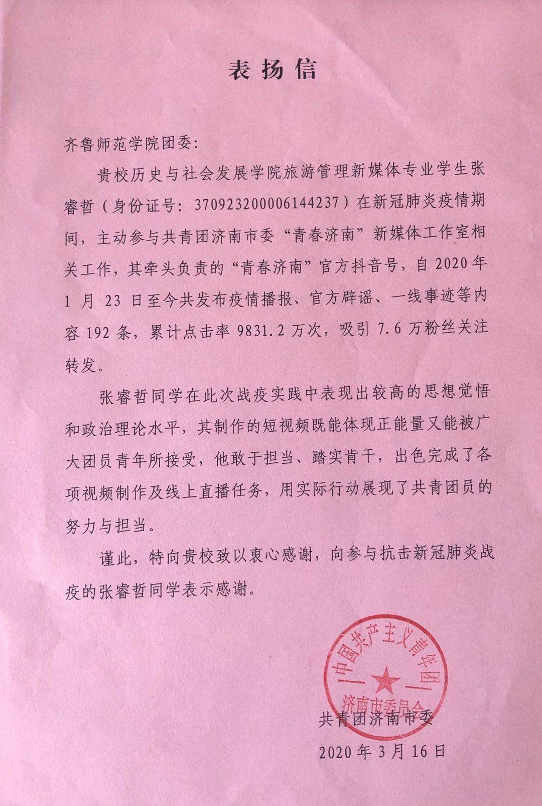 近日,校团委收到了一封来自共青团济南市委的表扬信,以表扬必赢官网张睿哲同学在参与抗击新冠肺炎疫情工作的艰辛付出,肯定学校为党育人、为国育才的办学成效,是广大青年团员学习的榜样。