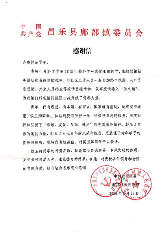 近日,生命科学学院收到了一封来自昌乐县鄌郚镇委员会的感谢信,信中对侯玉卿同学为社区防疫工作做出的突出贡献表示感谢。信中写道,侯玉卿同学主动站到疫情防控一线,积极投身志愿服务,与社区人员一起参加路口执勤、人口信息登记、外来人员排查等疫情防控活动,用实际行动弘扬了“奉献、友爱、互助、进步”的志愿服务精神,为鄌郚镇打好疫情防控阻击战贡献了青春力量。