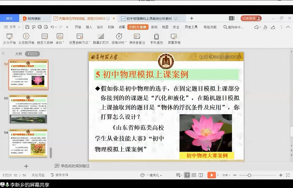 本次报告李新乡教授从解读大赛目的及评分标准入手,向与会师生共享了中学物理固定题目及随机题目模拟上课的备赛策略。强调比赛中学生要紧扣最新课标要求,注重过程评价,促进学生核心素养的发展等基本理念。