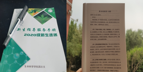 生命科学学院在接待点为每位同学发放了学院精心制作的《2020级新生指导服务手册》,手册虽然只有78页,但其字里行间都饱含着团总支老师们对于新生的深切情谊,这是一份指导和建议,更是一份期许与祝福。《新生指导服务手册》从“走进生科”、“学在生科”、“魅力生科”为切入点,让同学们在了解学校,了解生科院的基础上,学会快速适应和融入大学生活,更重要的是让新生们从入学之初就学会时间管理、制定目标、如何实现自我价值。当同学们看到“致2020级新生的一封信”时,都很感动生科院老师的良苦用心,纷纷表示这既是入学后的第一本参考指南,又是开启精彩大学生活的“精神食粮”。他们将带着老师的祝福,绽放青春、梦启生科。