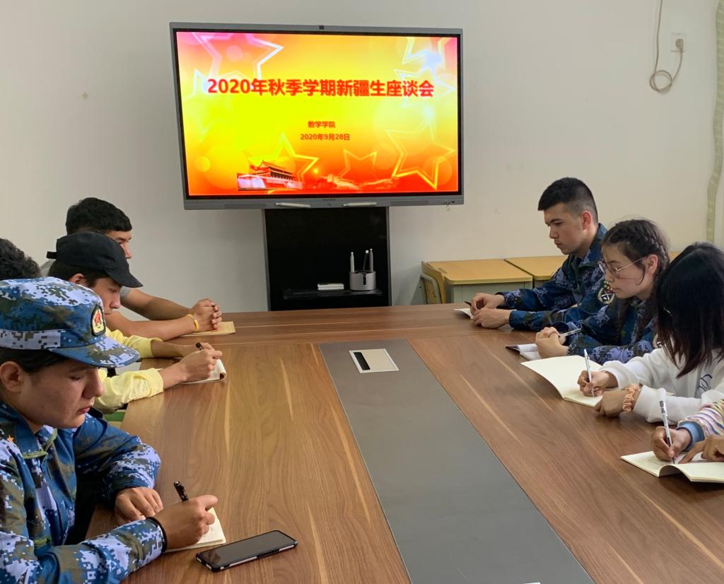 为了进一步加强新疆民族学生的思想道德教育,增强爱国主义情怀,将爱党、爱国、爱社会主义与学习、生活统一起来,在国庆、中秋双节来临之际,数学学院召开了2020年秋季学期新疆生座谈会。新疆内派教师阿依努尔、学院党总支副书记初益辰、团总支副书记孟凡湘及全体新疆学生参加座谈会,会议由初益辰主持。