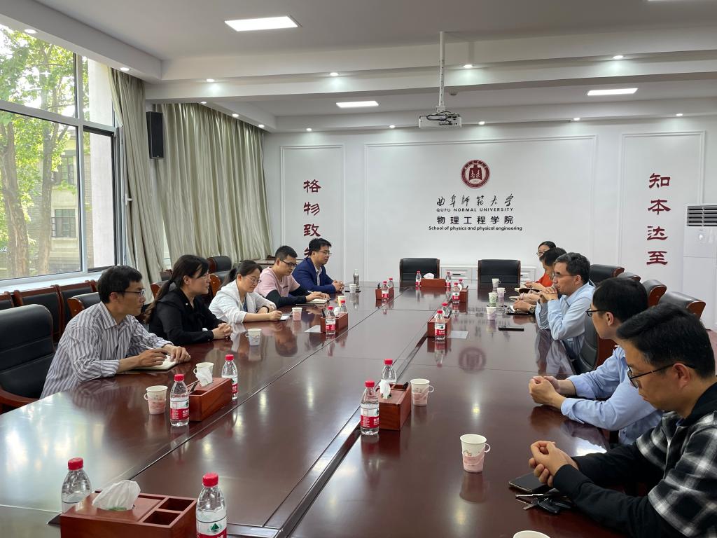 为深入推进学院“质量提升年”建设,搞好物理学师范专业认证准备工作,5月12日,物理与电子工程学院院长张洁一行6人,赴曲阜师范大学物理工程学院就完善物理学(师范类)专业人才培养方案和实践教学体系、师范认证准备等问题进行专项调研学习,院长助理刘萌、物理学教研室主任袁慧敏、团总支书记李华、办公室主任宋文哲、师范认证秘书刘鹏等参加参访学习。曲阜师范大学物理工程学院副院长王海龙教授、实验中心主任孟祥省、胡象岭、张英杰教授等接待参访,并与参访团一行举行座谈会。
