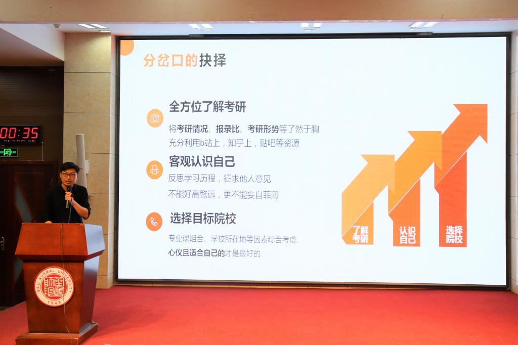 王政以“如何自己确定考研学校”为切入点,总结了以实验室经历为成功捷径的行动成果,就剖析在备考期间遇到的问题,与同学们分享了有效舒缓情绪、打消顾虑的方法。