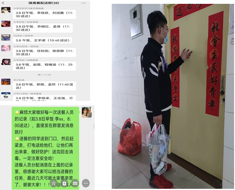 当得知部分学生被隔离在宿舍,历史文化学院学生党员、入党积极分子、学生干部自发成立志愿者分队,主动帮扶被隔离同学。他们第一时间成立隔离餐配送群,学生干部积极发动全体同学,安排好配送隔离餐值日表,学生们送完餐都会在群里进行反馈,真正地确保隔离同学一日三餐都能及时吃上热饭。除此之外,志愿者们还帮隔离宿舍倒垃圾,接热水等等。对于学习问题,学生干部提前联系老师,每节课都提前建立腾讯会议,让隔离学生能够在宿舍进行线上学习。历史文化学院关心慰问被隔离学生,虽然学生因疫情而隔离,但整个隔离期间隔离不隔心,温暖伴人心。
