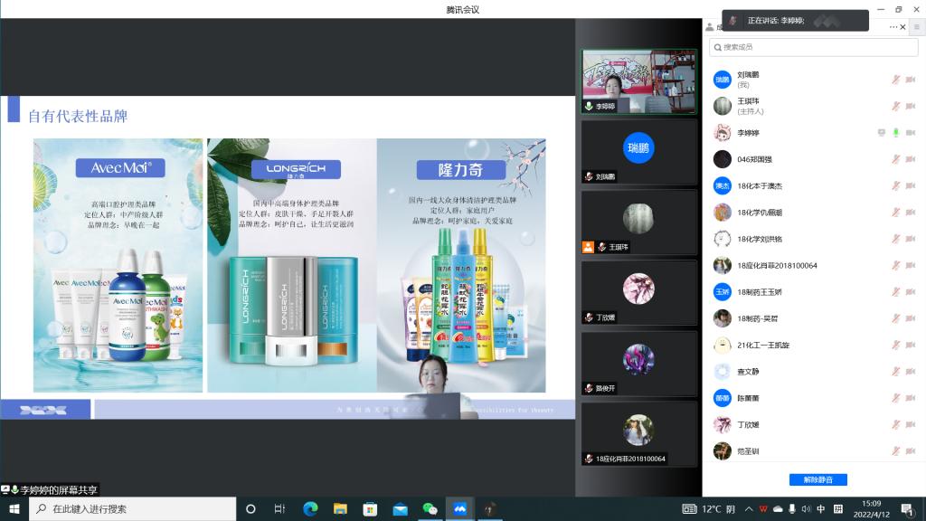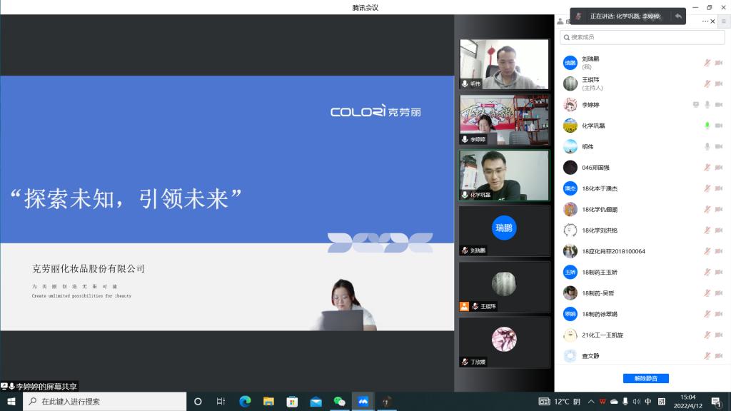 4月12日15:00,化学与化工学院举办2022届毕业生系列专场第六场招聘宣讲会,邀请江苏隆力奇生物科技股份有限公司旗下克劳丽化妆品有限公司人事部经理李婷婷为应届毕业生们介绍企业的相关情况及招聘岗位情况。化学与化工学院党委副书记巩磊、化妆品研究中心主任骆兴伟、2022届应届毕业生参加了本次宣讲会。