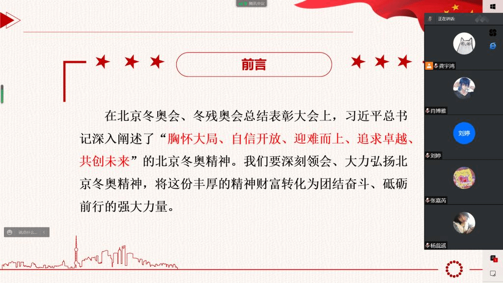 4月8日,北京冬奥会、冬残奥会总结表彰大会在北京人民大会堂隆重举行。化学与化工学院迅速掀起学习热潮,其中,2019级、2021级各团支部开展了以“弘扬北京冬奥精神,凝聚青春奋进力量”为主题的政治学习。此次学习采用“云会议”的方式进行,按照“1+4”的模式从新视界、习语录、学榜样和心互动四个环节展开,从学习总结表彰大会的会议精神,到回顾冬奥赛场上的高光时刻,再到感受台前幕后志愿者们的青春力量,帮助同学们进一步理解了北京冬奥精神,引导同学们树立积极乐观、自立自强、阳光自信的生活态度,形成热爱体育、崇尚运动的良好风气。