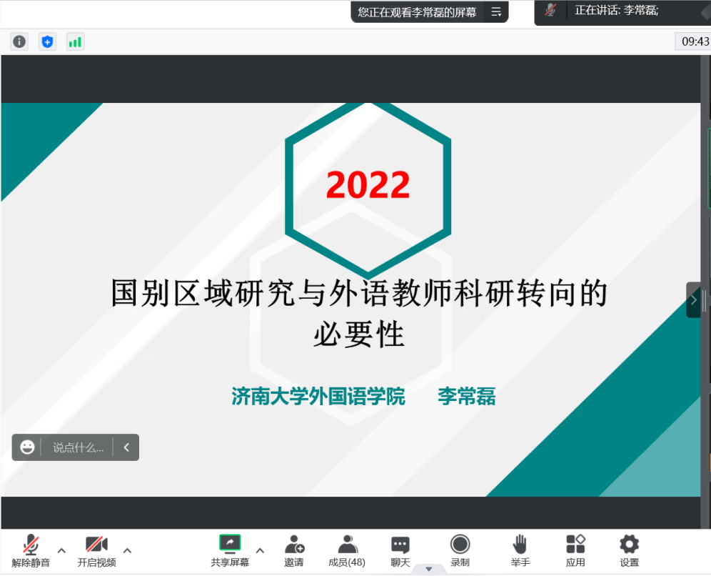 11月29日晚,外国语学院特邀济南大学外国语学院院长李常磊教授线上开展了“国别区域研究与外语教师科研转向的必要性”的专题讲座。本次讲座由外国语学院院长宋秀葵主持,外国语学院全体任课教师参加讲座。
