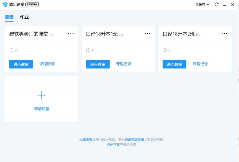 本图为登录之后腾讯课堂的界面。最近腾讯课堂新加入了分班和作业功能,较之以前的版本,操作起来更为方便。分班功能对于同时教授多个班级的老师来说是非常使用的功能,老师可以迅速准确找到某个特定班级。