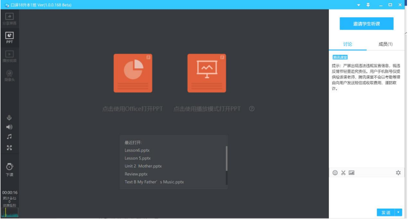 界面右边白色区域为讨论区,可以与学生进行文字互动,同时也可以查看成员,随时查看学生在教室的情况。中间黑色部分用于播放PPT或Office文档,如图所示: