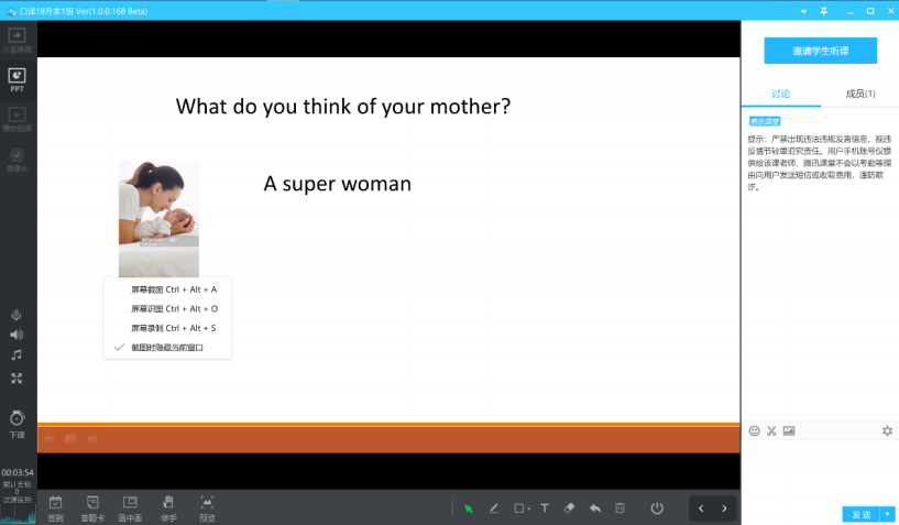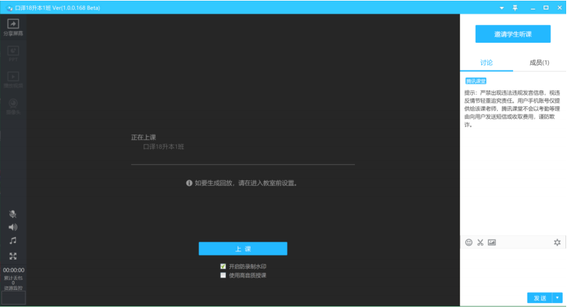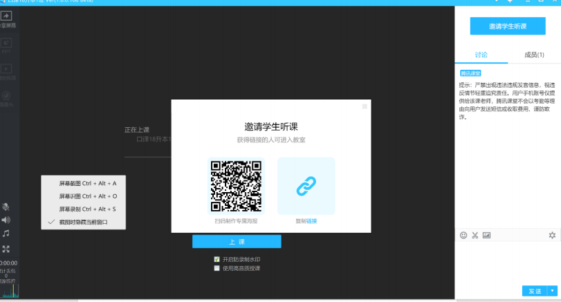 这是上课的界面。进入教室,首先点击右上角“邀请学生听课”。