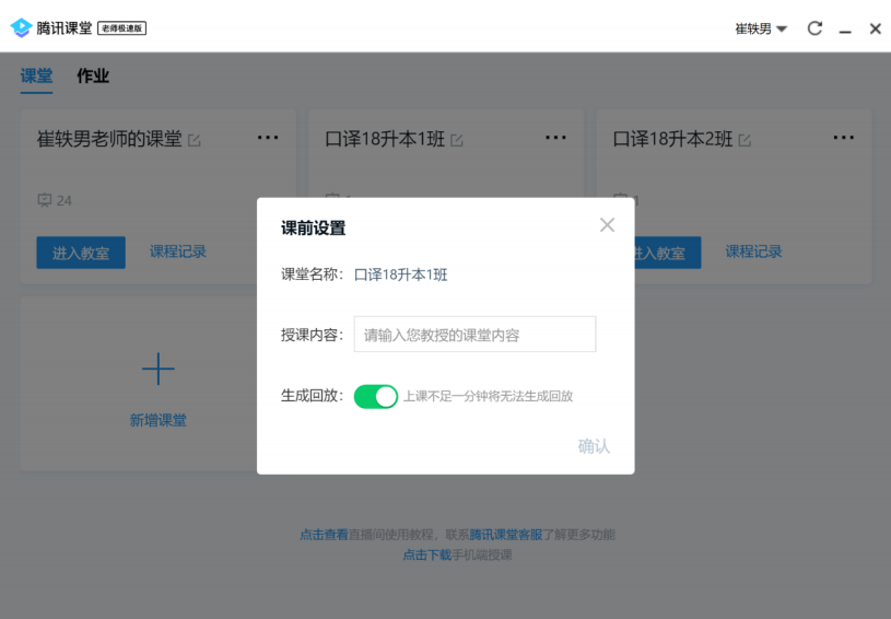 点击班级、输入授课内容、点击生成回放就可以进入教室开始上课了。