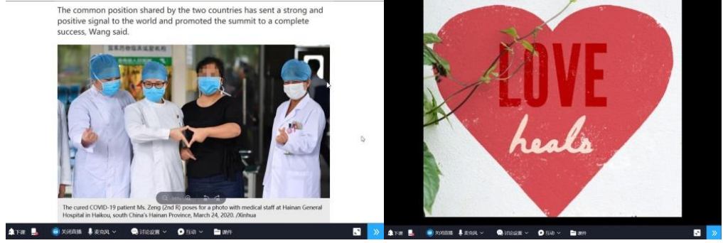 延迟开学,挡不住师生间真挚的关心和爱护。“Stay home. Stay safe”,老师们在直播间反复叮嘱。“Take Care. Keep Well”,学生们隔空对老师不断问候。小爱无痕,大爱无疆。课程思政要求教师不仅要系统而科学地传授知识,还要重视建立知识与人、知识与生活的多重交融关系,关注学生的心理状态,对他们进行思想引领、心灵触动,与他们共同感受家国情怀、中国力量。大学英语教师们在教授Doctor’s Dilemma这个单元时,从“医生面对的难题”这一角度出发,联系疫情中医务工作者们舍小家为大家,义无反顾地奔赴疫情防控一线,用专业的医疗技术与病毒抢时间,用强大的责任心守护着病人生命安全的英雄事迹。白衣天使“最美逆行者”的大爱精神、牺牲精神和奉献精神成为生动教材,教育引导学生珍爱生命,正确理解生命的真谛。
