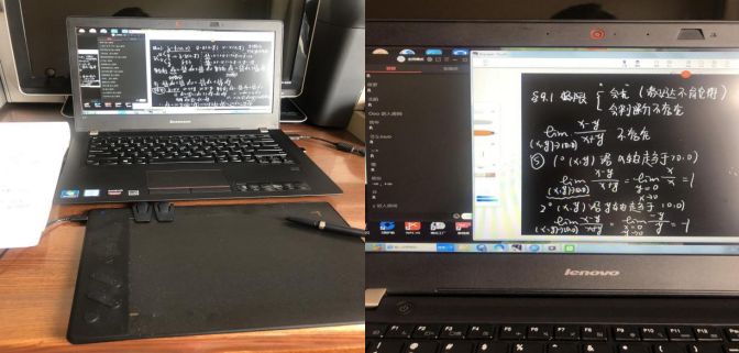 (2)手写板:数学课程需要给学生们演示推导过程和解题过程,开课前跟学生们调试的过程中发现了直播课中无法板书的缺点,且“QQ 课堂”提供的白板功能用鼠标书写费时且书 写内容过少,所以手写板是课堂中必不可少的设备。手写板配合直播课展示如下: