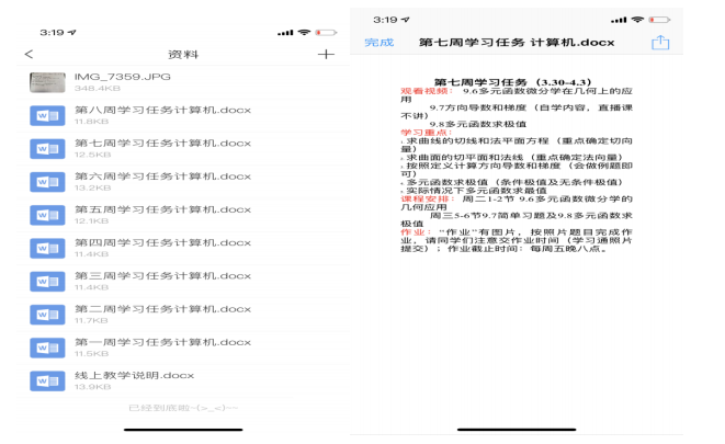 (2)资料:在“资料”中,跟学生调试过后准备开课前上传了“线上教学说明”,让学生们在课前做好准备。由于学生都没有教材,开课前已经在 QQ 群文件上传了教材的电子版。并且每周都在“资料”栏中上传下一周的学习任务、学习重点及作业(一般在前一周的周四或者周五),给出学生充分的预习时间。