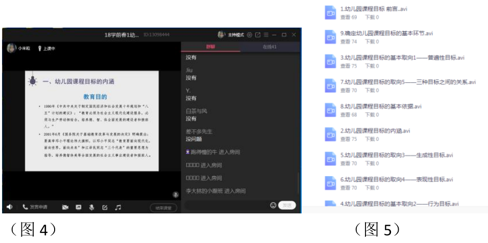 经过几周的探索,《幼儿园课程》逐渐形成了“ 课前 预习 —— 课 上互动 ——课后 巩固”的学习模式,采用“ 共享课+ 录播+ 直播交流+ 课下作业”的形式。