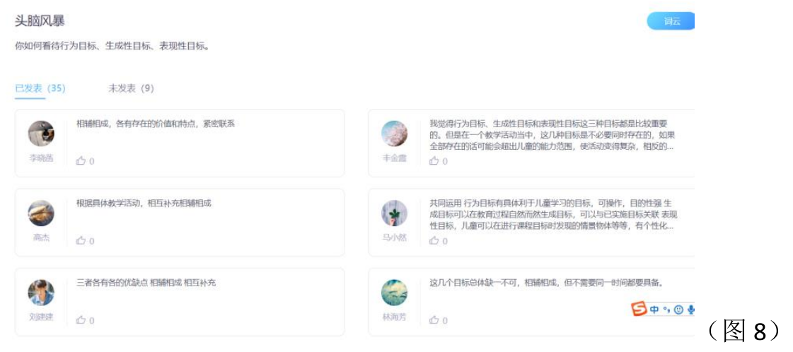在授课过程中每一个知识点的学习都进行互动(图 6、7),并且通过头脑风暴进行师生研讨式学习(图 8)。