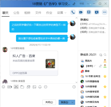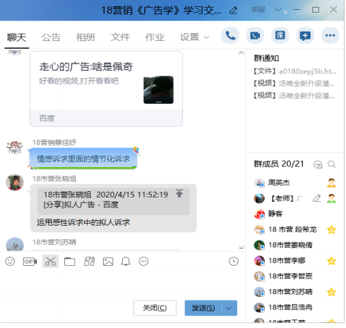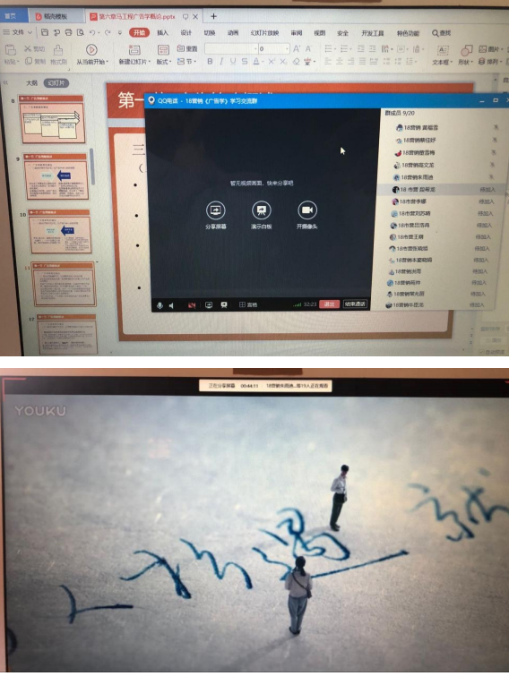 3.共享屏幕、直播教学。利用 QQ 的“分享屏幕”功能,对教学 PPT 进行直播讲解,将线下课堂搬到线上来进行。线上直播相比教室教学来说,不能面对面及时发现学生的反馈与状态,课堂气氛较难控制,所以在 PPT 制作与讲解的过程中尽可能丰富化,吸引学生的注意力与兴趣,提高学生的参与度。本身广告的学习需要很多的广告素材,尤其是视频广告,所以在 PPT 制作中会在知识点旁配上相应的广告视频,边看边讲解,提高学习兴趣。直播过程中随机提问学生问题,督促学生集中注意力听课,也会让学生发当时的屏幕截图过来,保证学生一直在线学习。