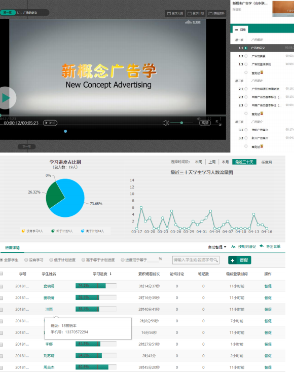 经过筛选,选用了智慧树平台的共享课程:山东联盟的《新概念广告学》,该课程的在线教程和教学资源与我们这门课的课程内容最相近,视频讲解重点突出、逻辑清晰、语速适中,适合学生观看学习。但是,仅仅利用现成的线上课程学习的话,学生自主性较差,学习兴趣不高,注意力不集中,而且教学视频与我们的教学安排不是完全相符,所以,只是把这门共享课作为我们的辅助教学资源,帮助学生进行课前预习、课后巩固以及知识点的延申跟章节测试。