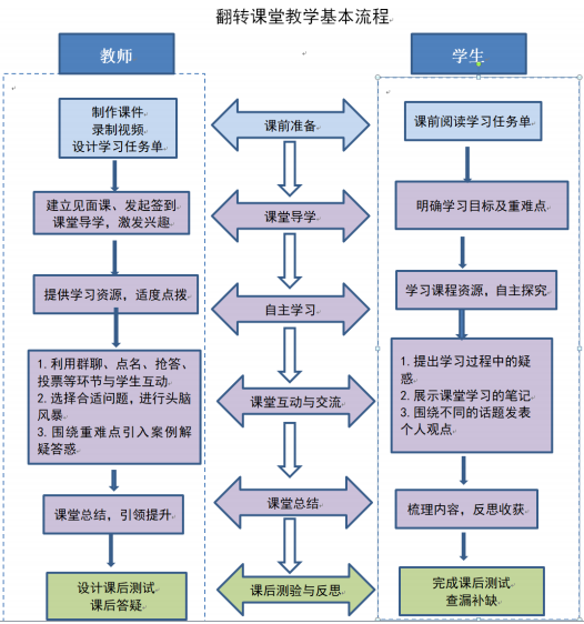 所谓翻转课堂,其实就是指教学中课堂上和课堂下的功能的翻转。相对于传统课堂上教师教学生学,课下学生做作业的教学模式,“翻转课堂”中,学生在课下自学课程内容,课堂上做应用练习或讨论。考虑到疫情期间学生网络学习压力比较大,为了避免給学生带来过大的学习压力同时保证教学效果,我们结合具体学情将课堂教学流程进行了如下改良: