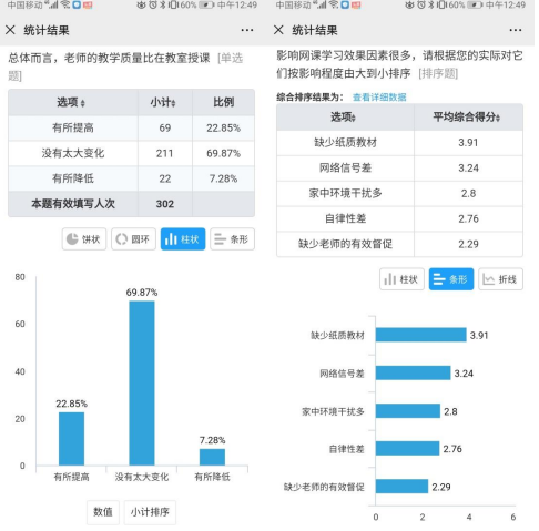 经过近两个月的网络学习,为了更加全面掌握学生网络学习的情况我们教师团队利用问卷星对学生的学习情况进行了调查,了解学生学习过程中的困难,广泛征求学生的学习建议,进一步改善教学中的问题本次调查共收到 302 份问卷,76.82%的同学乐意接受这种新型网络授课方式,有 69.87%的同学认为老师的教学效果与在教室授课的教学效果没有太大变化,22.85%的同学认为比在传统授课有所提高,在影响网络学习效果因素调查中,了解到主要受到 “缺少纸质教材、网络信号差、家中环境干扰多、自律性差、缺少老师的有效监督”等因素的制约。在课堂互动方面,学生最喜欢的互动方式分别是课堂答疑、头脑风暴、抢答问题、点名回答问题。