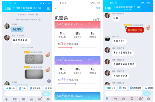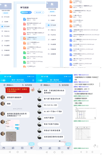 课堂小组讨论非常重要,一个班级有6个小组,一个小组6到7人,主要就有难度的小视频,或者留有思考题的小视频,或者老师提出的新问题进行讨论。每节课基本有一个固定小组讨论时间,十到二十分钟。讨论的形式多种多样,有语音群讨论,有文字群讨论,还有同学利用自己专业优势,编写专用小程序进行小组讨论。讨论完成后,有讨论结果的提交最终解题答案,没有出结果的提交讨论过程以及形成的意见。如下图所示。