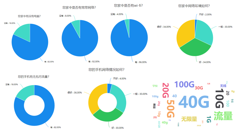 如图所示,18%的学生家中无电脑配置,但都有智能手机,92%的学生家中有宽带网络,96%的家中有WiFi环境且网络信号大都可以满足上网需求;82%的学生有手机流量包月且移动网络状况不佳的仅有4%;手机流量集中在10G、20G、40G、50G、100G和无限量。由此可知,排舞选项班绝的大部分学生在设备与网络配置方面有所保障,在硬件上能课保证网课的顺利进行。