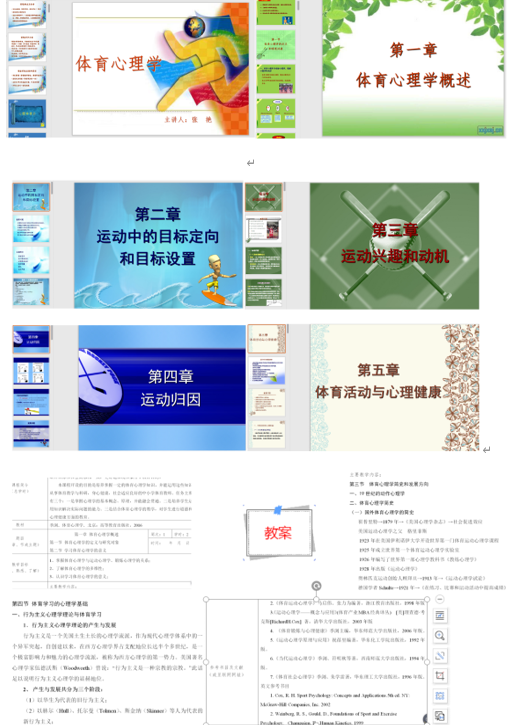 开课至今学习了心理学导论及前五章的内容。心理学导论部分主要给学生介绍什么是心理学,人们对心理学的误区、研究的对象与内容、心理的实质、心理学流派等,为学生对体育心理学的学习做铺垫;体育心理学概述部分讲述体育心理学的定义与研究对象、学习体育心理学的意义、简史和发展方向以及体育学习的心理学基础;第二章主要使学生掌握体育活动中的学习目标定向和成绩目标定向的区别、体育教学中培养学生学习目标定向的方法,掌握体育教学训练中进行目标设置的原则,熟悉团队的特点及团队目标的功能及团队目标的设置方法及注意事项;第三章通过学习使学生理解运动兴趣的定义、品质、分类及其重要性,了解运动兴趣形成的因素,进而使学生了解运动兴趣对学生终身体育的重要性,掌握运动动机的定义、功能和种类,了解动机理论及其在体育运动中的应用;第四章主要掌握维纳的归因理论并能能利用该归因理论对运动情境中的胜败结果进行有效地分析,了解影响运动归因的主要因素,能利用归因训练的方法帮助青少年克服运动中习得性无助感,提高运动中的自信心;第五章教授还未结束,主要让学生掌握体育活动的心理效益,理解影响体育锻炼坚持性的各种因素,了解各种锻炼行为理论及什么是体育活动成瘾。