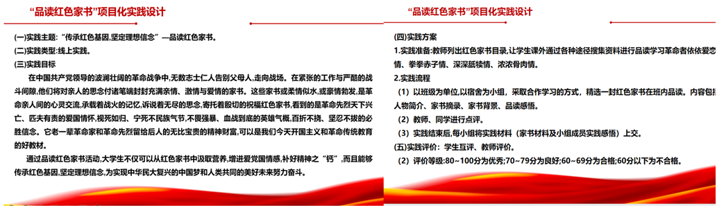 线上教学的特点限制了日常课堂实践教学的开展。但“概论”课是思想理论课,理论一旦脱离实际就失去了自身的魅力和价值。怎样有效地开展线上实践教学来加深学生对理论学习的理解和运用呢?在教学实践中根据课程目标,结合学生的有利条件,开展了了项目化线上实践教学。比如,在讲授“新民主主义理论”内容时,为加深学生对中国共产党革命精神的理解,向学生布置了“品读红色家书”项目化实践内容。方案如下图: