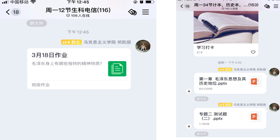 腾讯会议具有容量大、支持多人视频、共享课件、操作简单等优势,能通过视频直播和视频互动增强线上真学的真实感。但腾讯会议是即时性的,没有群管理、文件分享功能,所以无法延伸课堂教学,而QQ群课堂弥补了腾讯会议这个缺陷。在“概论”课课线上教学实践中,在腾讯视频直播结束后,利用QQ群课堂分享教学资料、和同学们交流讨论、布置作业等功能,对线上教学进行了延伸。下图就是我利用QQ群课堂补充腾讯会议的不足,进行课下延伸的情况。