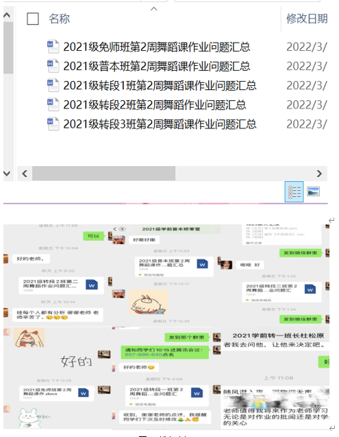 在线上直播教学中,教师的点评不可或缺。教师与学生之间的互动也受到了屏幕大阻隔,不能达到面对面纠正的效果,为了弥补这一问题,课后有必要布置作业让学生发舞蹈视频,教师进行一对一点评与指导。