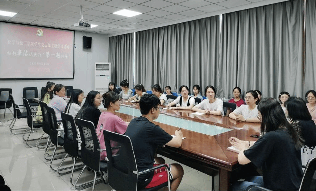 为深入开展学习贯彻习近平新时代中国特色社会主义思想主题教育,加强校园廉洁文化建设和毕业生思想教育,引导毕业生树牢廉洁修身、廉洁从业的意识,6月21日下午,化学与化工学院学生党支部在会议室开展“扣好廉洁从业的‘第一粒扣子’”主题党日活动,学生党支部书记张凤云、副书记杨睿、组织委员董坤及2023届毕业生党员参加活动。活动由张凤云主持。