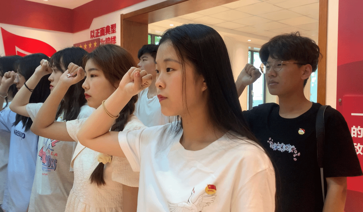 最后,在这浓厚的党史学习氛围中,2019级药品生产技术三班团支部在团旗下重温入团誓词,全体团员高举右拳,在鲜艳的团旗下庄严宣誓:“我志愿加入中国共产主义青年团......”铿锵有力的誓词回荡在现场每一位团员心中。